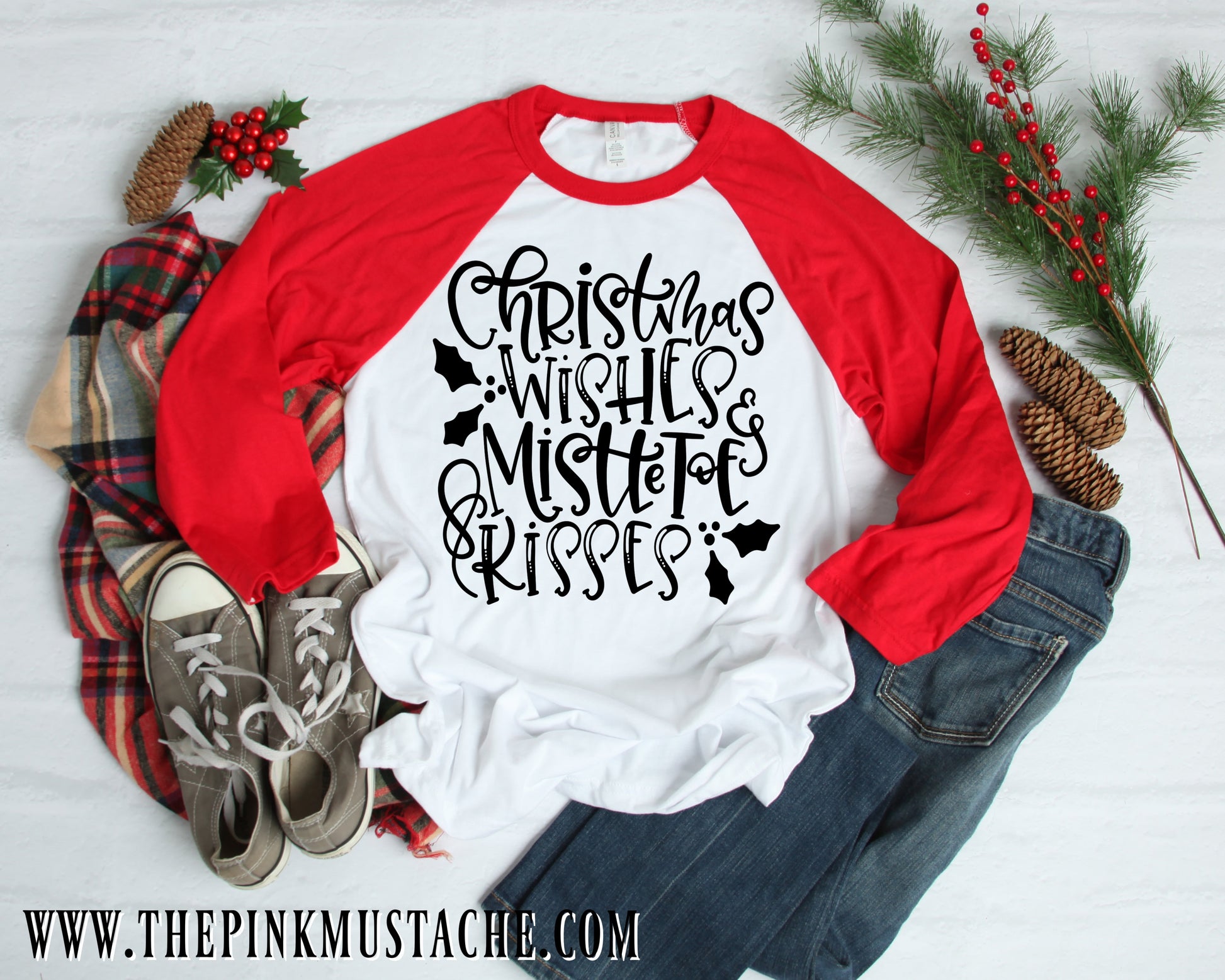 Christmas Wishes and Mistletoe Kisses Raglan / Merry Christmas Boutique Graphic Raglan / Youth and Adult sizing / Buffalo Plaid Christmas
