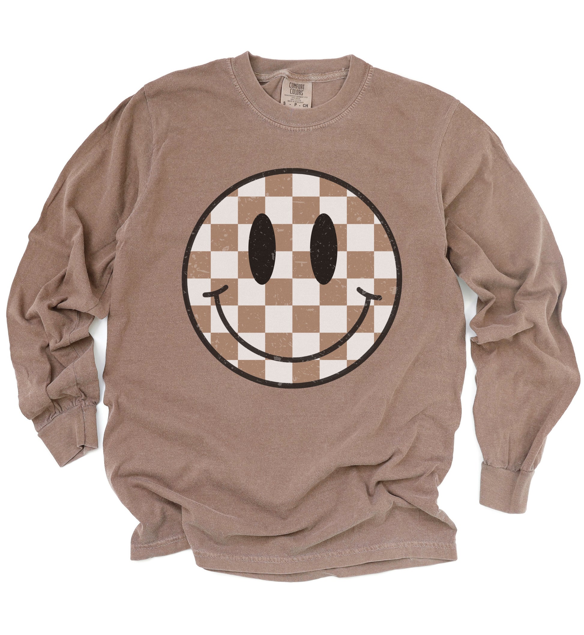 Comfort Colors Long Sleeve Espresso Smiley Checkered Shirt