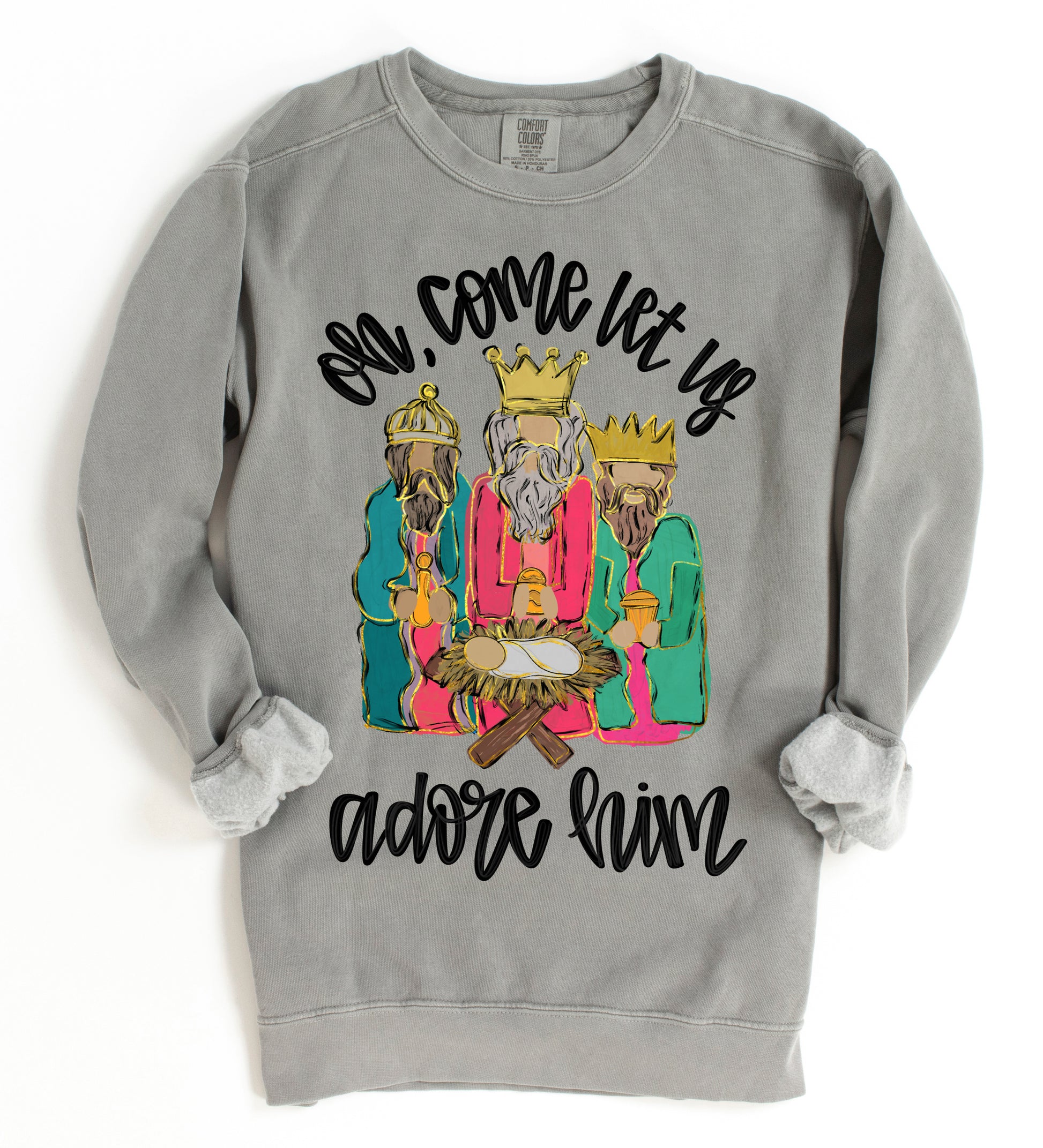 Comfort Colors Oh Come Let Us Adore Him Three Wise Men Christmas Sweatshirt/ Direct To Film Transfered Faux Glitter Sweatshirt