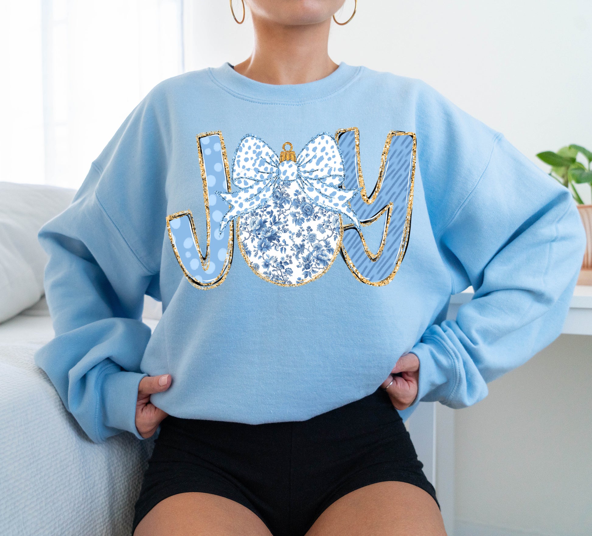 Light Blue Grand Millennial Joy Christmas Faux Glitter Sweatshirt/ Youth and Adult Sizes