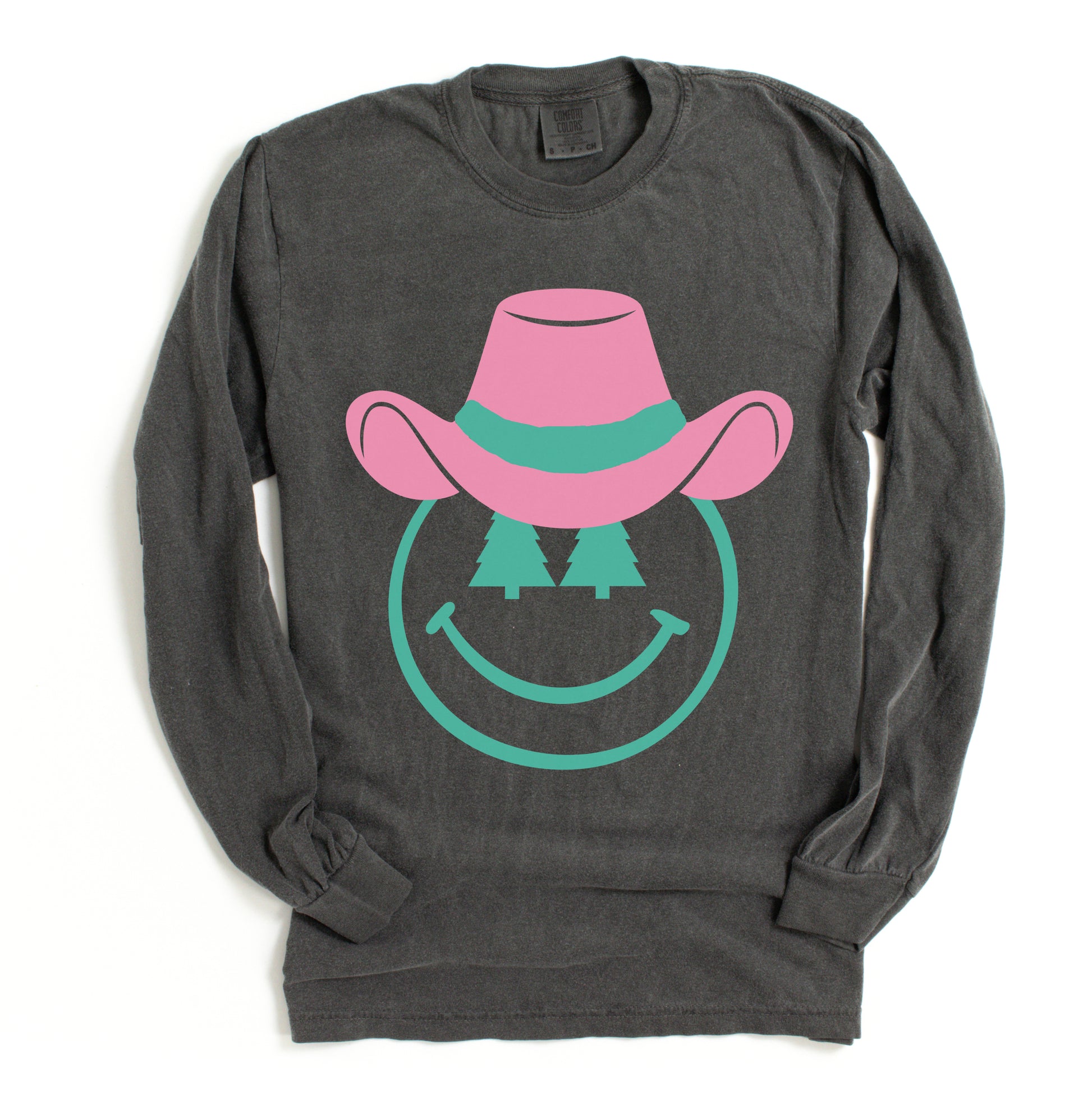 Long Sleeve Comfort Colors Christmas Shirt- Cowboy Tree Smiley - Youth and Adult Sizes