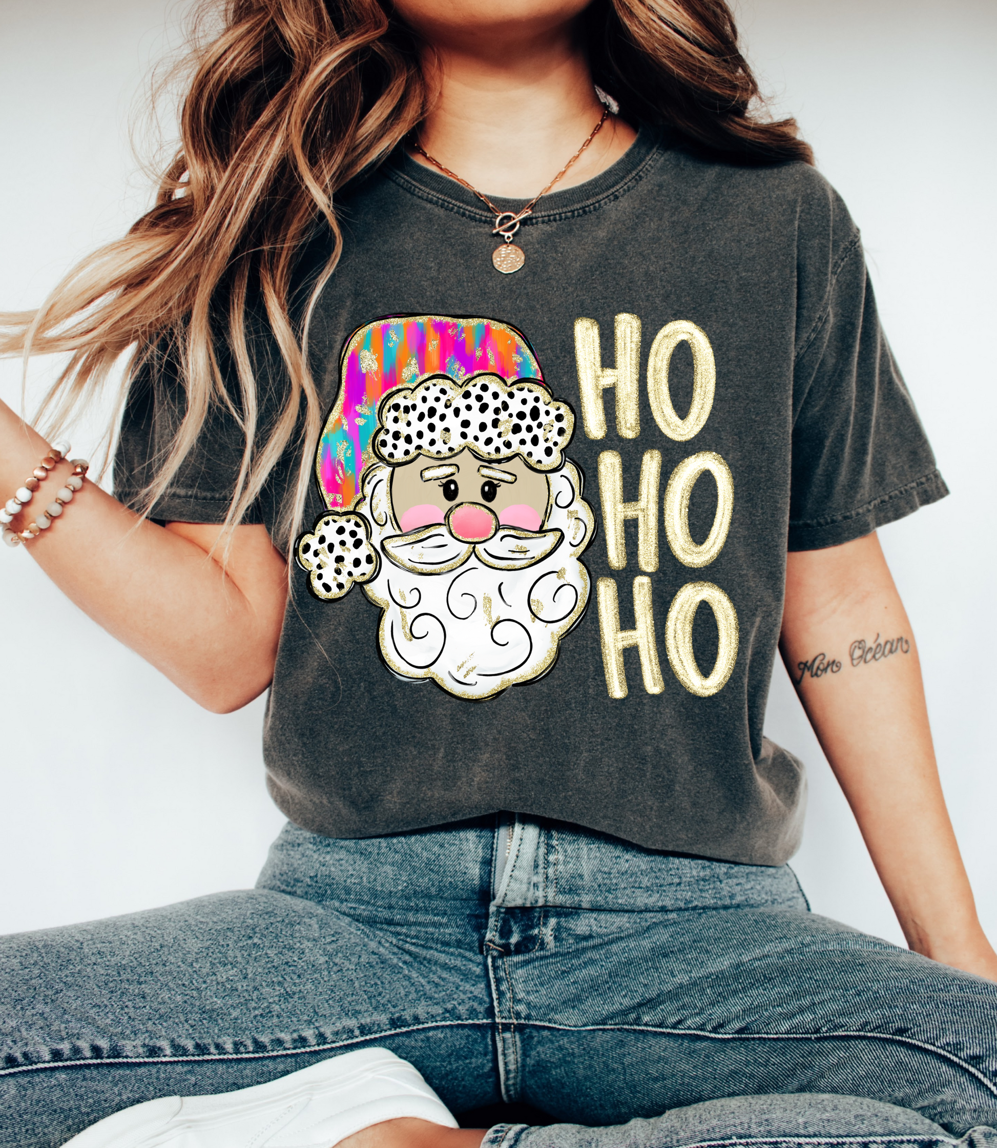Pepper Bella or Comfort Colors Santa Ho Ho Ho Christmas Tee/ Short Sleeve Faux Glitter Direct To Film Shirt