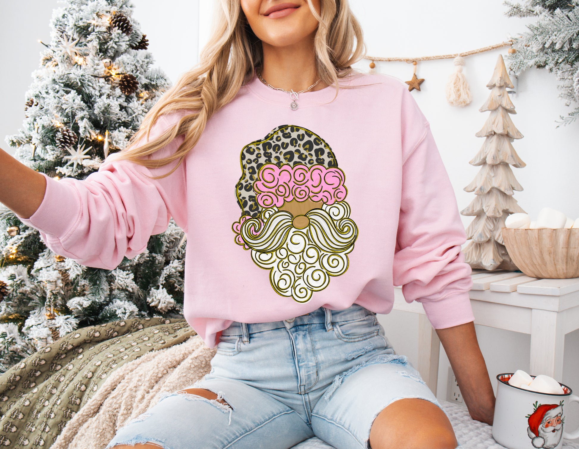 Pink Leopard Santa Retro Gildan or Bella Christmas Sweatshirt/ Holiday Sweatshirt/ Youth and Adult Sizes