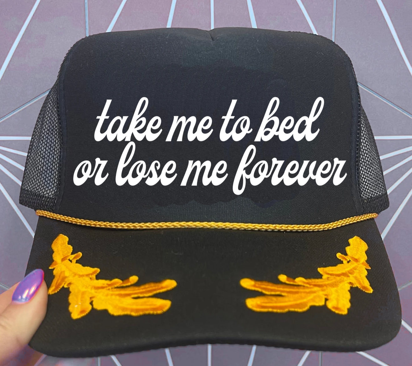 Take Me To Bed or Lose Me Forever Trucker Cap/ Funny Trucker Hats/ Black Hat Leaves